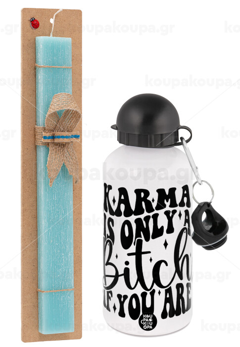 Karma is Only A Bitch if You Are, Easter Set, metallic aluminum water bottle (500ml) & scented flat candle (30cm) (TURQUOISE)