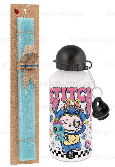 Labubu Stitch, Easter Set, metallic aluminum water bottle (500ml) & scented flat candle (30cm) (TURQUOISE)