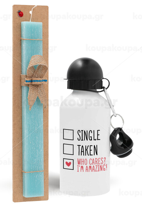 Single, Taken, Who cares i'm amazing, Easter Set, metallic aluminum water bottle (500ml) & scented flat candle (30cm) (TURQUOISE)