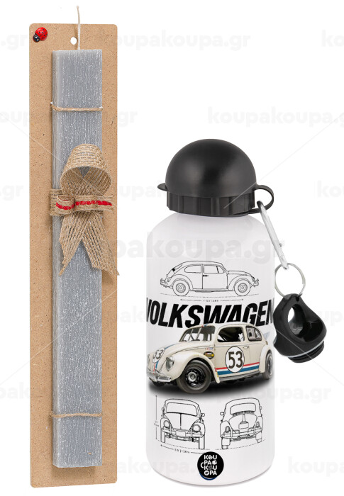 Volkswagen Beetle, Easter Set, metallic aluminum water bottle (500ml) & aromatic flat Easter candle (30cm) (GRAY)