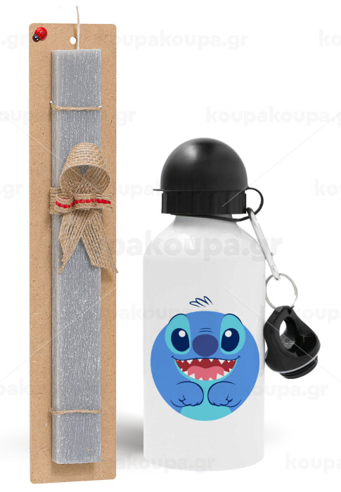 Lilo & Stitch blue, Easter Set, metallic aluminum water bottle (500ml) & aromatic flat Easter candle (30cm) (GRAY)