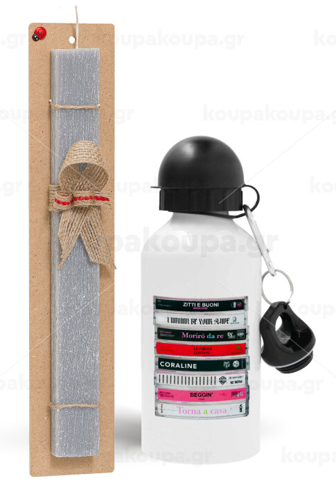 Maneskin Cassette, Easter Set, metallic aluminum water bottle (500ml) & aromatic flat Easter candle (30cm) (GRAY)