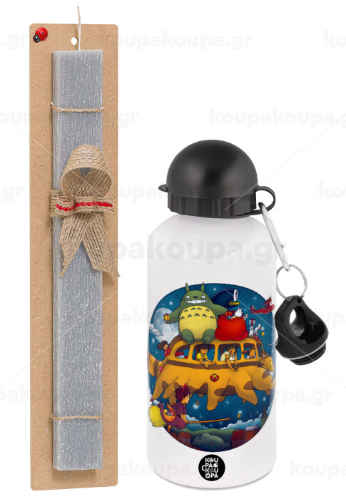 Totoro Catbus, Easter Set, metallic aluminum water bottle (500ml) & aromatic flat Easter candle (30cm) (GRAY)