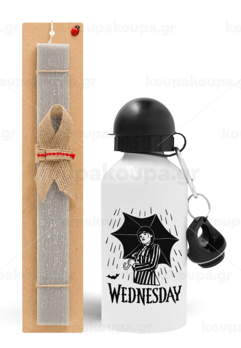 Wednesday Addams, Easter Set, metallic aluminum water bottle (500ml) & aromatic flat Easter candle (30cm) (GRAY)