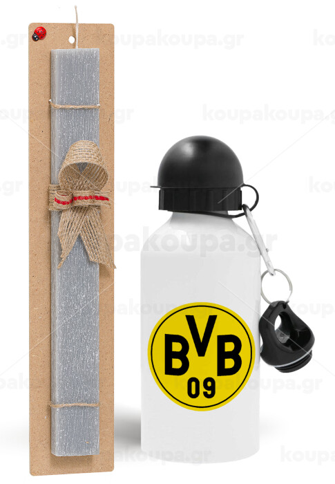 BVB Dortmund, Easter Set, metallic aluminum water bottle (500ml) & aromatic flat Easter candle (30cm) (GRAY)
