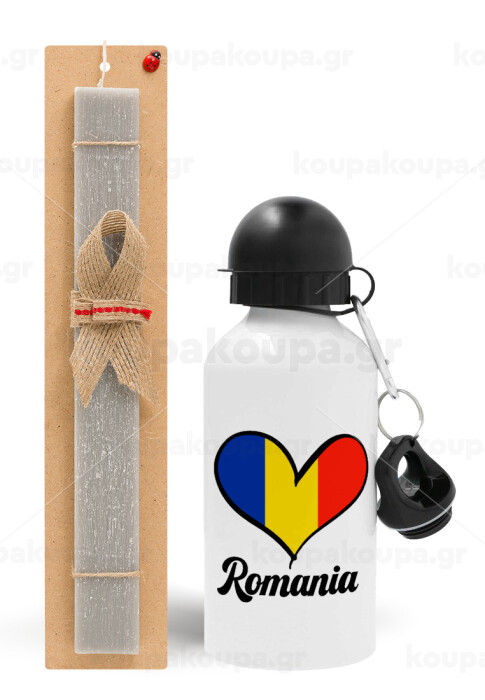 Romania flag, Easter Set, metallic aluminum water bottle (500ml) & aromatic flat Easter candle (30cm) (GRAY)