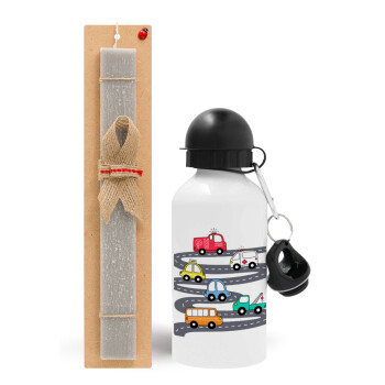 Hand drawn childish set with cars, Easter Set, metallic aluminum water bottle (500ml) & aromatic flat Easter candle (30cm) (GRAY)