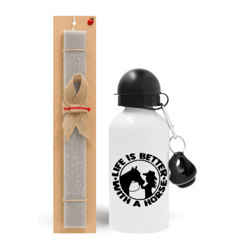 Life is Better with a Horse, Easter Set, metallic aluminum water bottle (500ml) & aromatic flat Easter candle (30cm) (GRAY)
