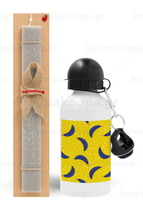 Yellow seamless with blue bananas, Easter Set, metallic aluminum water bottle (500ml) & aromatic flat Easter candle (30cm) (GRAY)