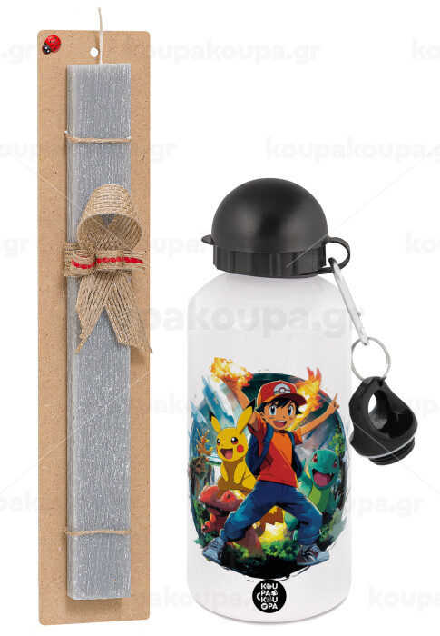 Ash Ketchum & Pikachu, Easter Set, metallic aluminum water bottle (500ml) & aromatic flat Easter candle (30cm) (GRAY)