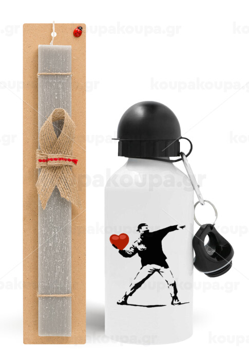 Banksy (The heart thrower), Easter Set, metallic aluminum water bottle (500ml) & aromatic flat Easter candle (30cm) (GRAY)