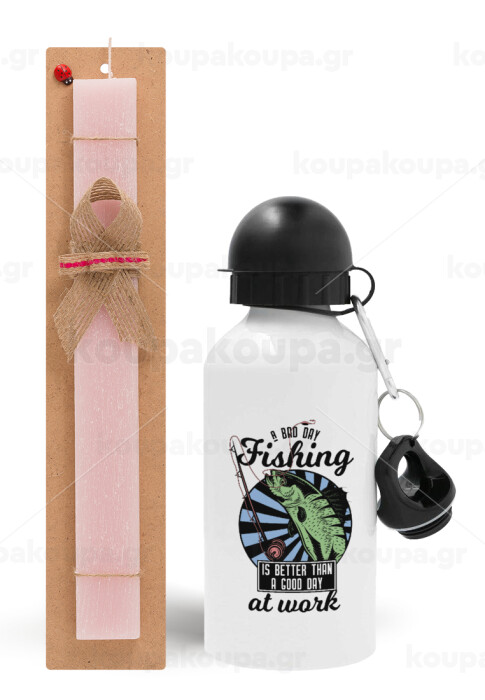 A bad day FISHING is better than a good day at work, Easter Set, metallic aluminum bottle (500ml) & aromatic flat Easter candle (30cm) (PINK)
