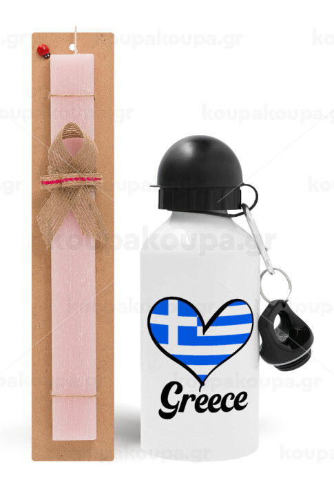 Greece flag, Easter Set, metallic aluminum bottle (500ml) & aromatic flat Easter candle (30cm) (PINK)
