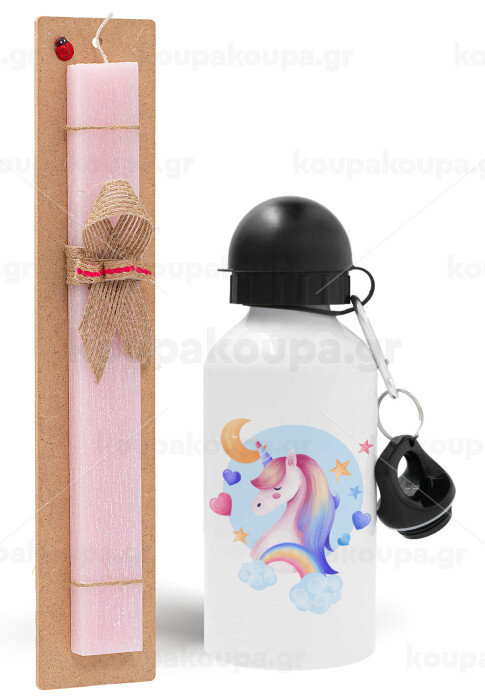 Cute unicorn, Easter Set, metallic aluminum bottle (500ml) & aromatic flat Easter candle (30cm) (PINK)