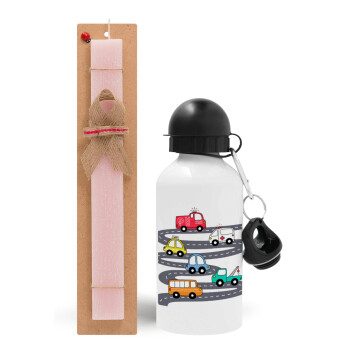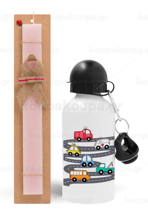Hand drawn childish set with cars, Easter Set, metallic aluminum bottle (500ml) & aromatic flat Easter candle (30cm) (PINK)
