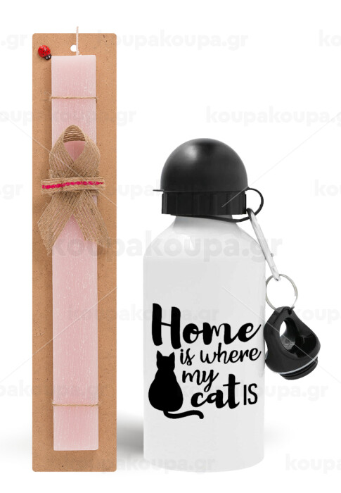 Home is where my cat is!, Easter Set, metallic aluminum bottle (500ml) & aromatic flat Easter candle (30cm) (PINK)