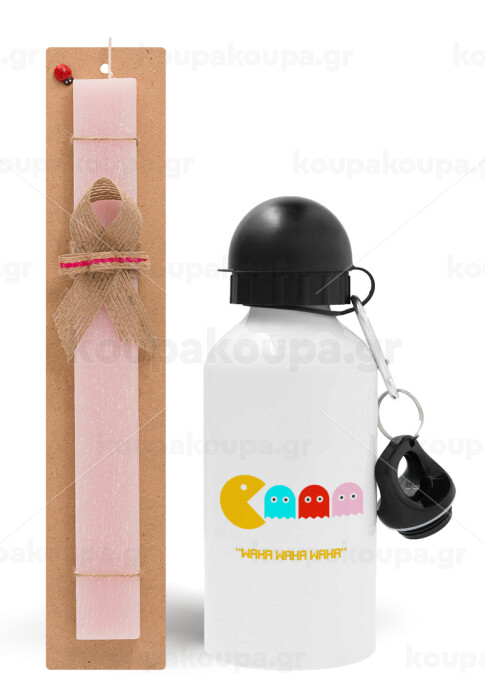 Pacman waka waka waka, Easter Set, metallic aluminum bottle (500ml) & aromatic flat Easter candle (30cm) (PINK)