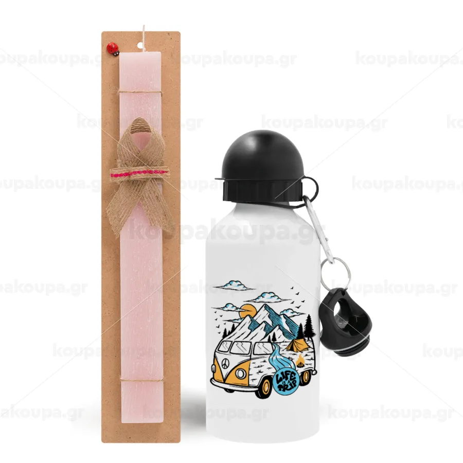 Life is a trip, Easter Set, metallic aluminum bottle (500ml) & aromatic flat Easter candle (30cm) (PINK)