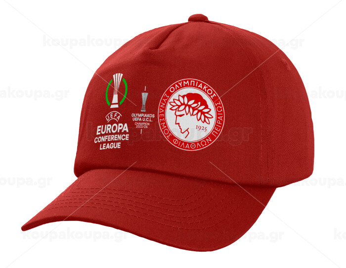 Olympiacos UEFA Europa Conference League Champion 2023/24, Children's Baseball Cap, 100% Cotton Twill, Red (COTTON, CHILDREN'S, UNISEX, ONE SIZE)