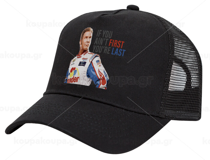 If You Ain't First You're Last Ricky Bobby, Talladega Nights, Trucker Hat with Mesh, Black, (COTTON, KIDS, UNISEX, ONE SIZE)