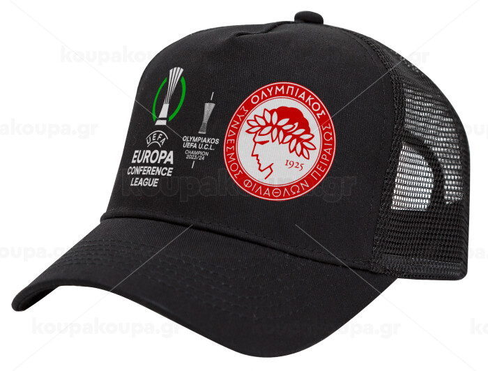 Olympiacos UEFA Europa Conference League Champion 2023/24, Trucker Hat with Mesh, Black, (COTTON, KIDS, UNISEX, ONE SIZE)