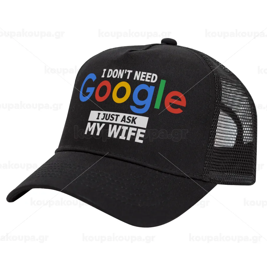 I don't need Google, just ask my WIFE, Trucker Hat with Mesh, Black, (COTTON, KIDS, UNISEX, ONE SIZE)