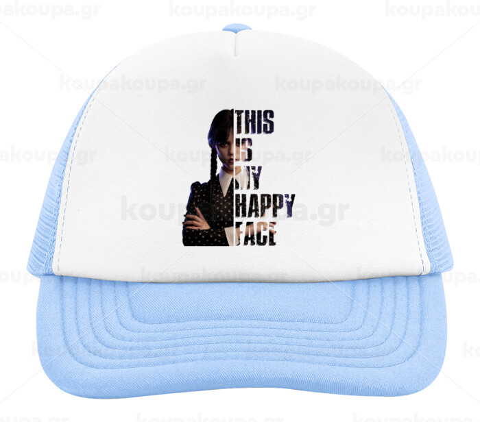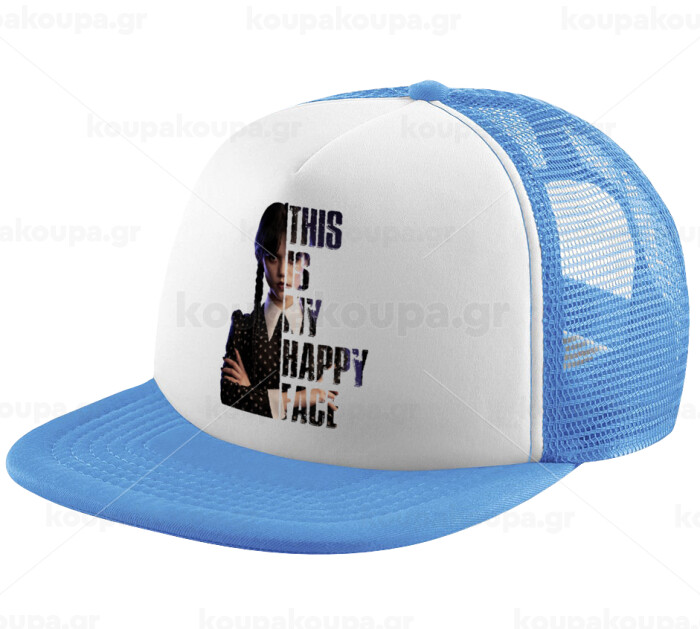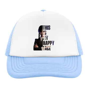 Wednesday, This is my happy face, Child's Soft Trucker Hat with Blue/White Mesh (POLYESTER, CHILD, ONE SIZE)