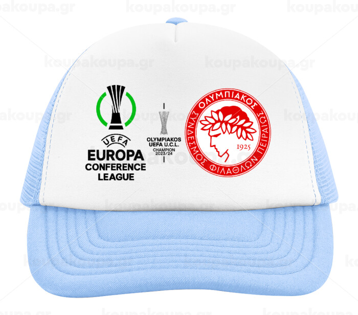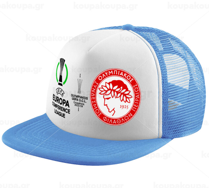 Olympiacos UEFA Europa Conference League Champion 2023/24, Child's Soft Trucker Hat with Blue/White Mesh (POLYESTER, CHILD, ONE SIZE)