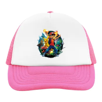 Ash Ketchum & Pikachu, Child's Soft Trucker Hat with Pink/White Mesh (POLYESTER, CHILD, ONE SIZE)