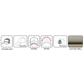 Discover the five-panel Structured Trucker hats with mesh and hard front forehead in our online store. They are made from 100% cotton fabric for comfort and quality. The mesh at the back is made from 100% polyester (mesh). It features a curved brim with 6 stitches for style and durability. The hat has an adjustable plastic closure, allowing easy adjustment to the size.