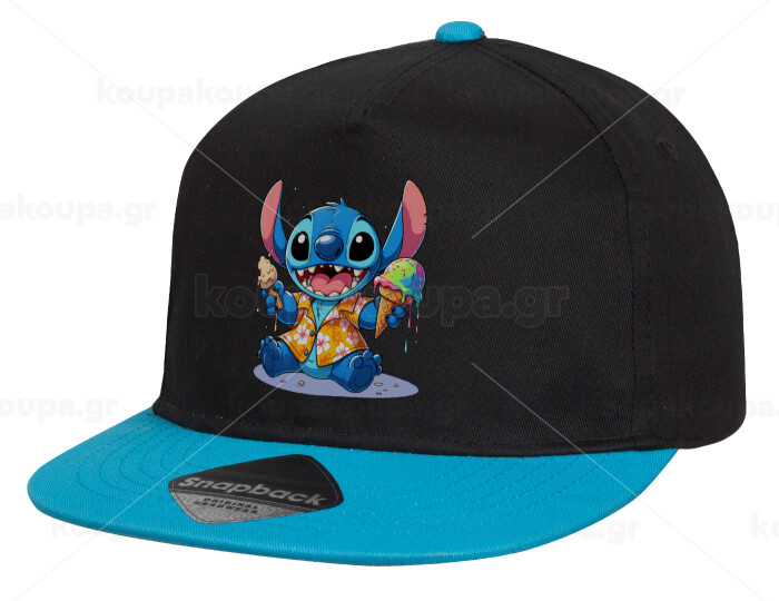 Stitch Ice cream, Child's Flat Snapback Hat, Black/Blue (100% COTTON, CHILD, UNISEX, ONE SIZE)