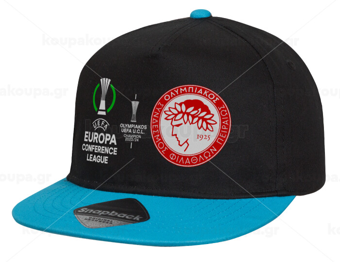 Olympiacos UEFA Europa Conference League Champion 2023/24, Child's Flat Snapback Hat, Black/Blue (100% COTTON, CHILD, UNISEX, ONE SIZE)