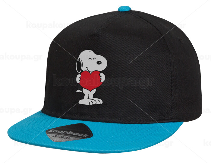Snoopy takemy heart, Child's Flat Snapback Hat, Black/Blue (100% COTTON, CHILD, UNISEX, ONE SIZE)