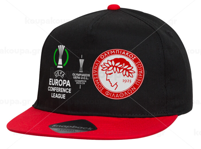 Olympiacos UEFA Europa Conference League Champion 2023/24, Children's Flat Snapback Hat, Black/Red (100% COTTON, CHILDREN'S, UNISEX, ONE SIZE)