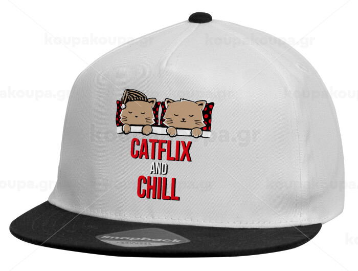 Catflix and Chill, Child's Flat Snapback Hat, White (100% COTTON, CHILDREN'S, UNISEX, ONE SIZE)