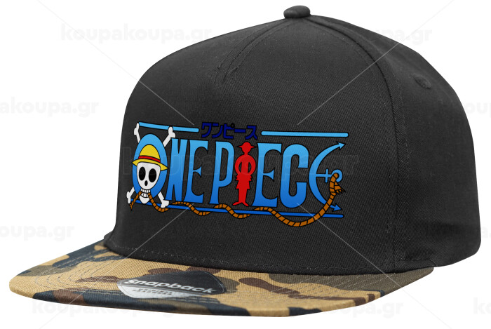 Onepiece logo, Adult Flat Snapback Hat Black/Camouflage, (100% COTTON TWILL, ADULT, UNISEX, ONE SIZE)