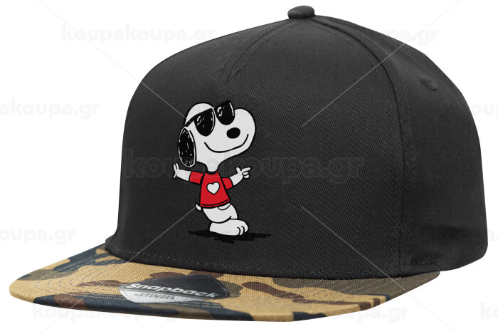 Snoopy καρδούλα, Adult Flat Snapback Hat Black/Camouflage, (100% COTTON TWILL, ADULT, UNISEX, ONE SIZE)