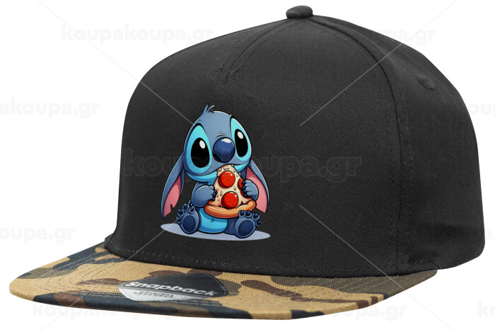 Stitch Pizza, Adult Flat Snapback Hat Black/Camouflage, (100% COTTON TWILL, ADULT, UNISEX, ONE SIZE)