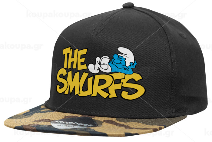The smurfs, Adult Flat Snapback Hat Black/Camouflage, (100% COTTON TWILL, ADULT, UNISEX, ONE SIZE)
