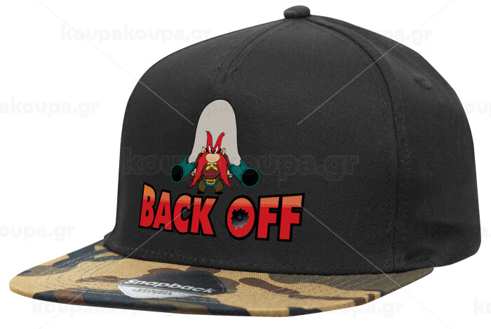 Yosemite Sam Back OFF, Adult Flat Snapback Hat Black/Camouflage, (100% COTTON TWILL, ADULT, UNISEX, ONE SIZE)