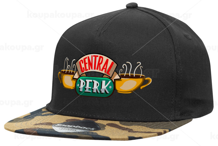 Central perk, Adult Flat Snapback Hat Black/Camouflage, (100% COTTON TWILL, ADULT, UNISEX, ONE SIZE)