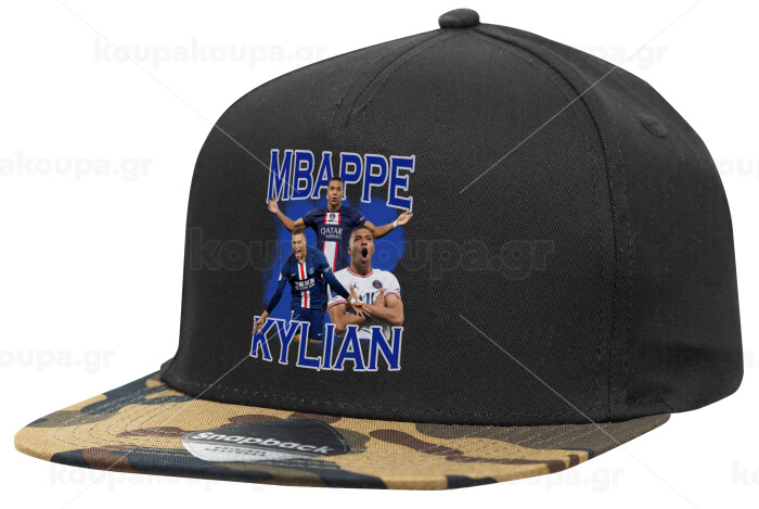 Kylian Mbappé, Adult Flat Snapback Hat Black/Camouflage, (100% COTTON TWILL, ADULT, UNISEX, ONE SIZE)