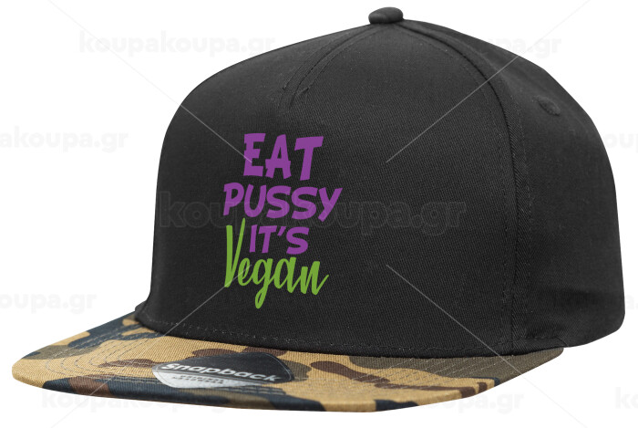 EAT pussy it's vegan, Adult Flat Snapback Hat Black/Camouflage, (100% COTTON TWILL, ADULT, UNISEX, ONE SIZE)