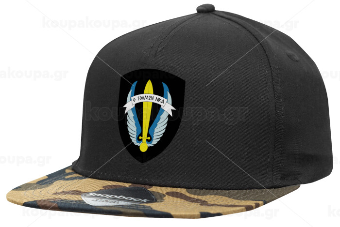 Έμβλημα Μονάδων Καταδρομών Ο Τολμων Νικα - Λοκ, Adult Flat Snapback Hat Black/Camouflage, (100% COTTON TWILL, ADULT, UNISEX, ONE SIZE)