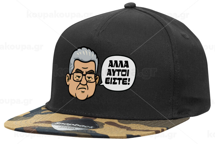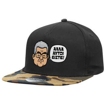 Κουτσούμπας, "Αλλά αυτοί είστε!", Adult Flat Snapback Hat Black/Camouflage, (100% COTTON TWILL, ADULT, UNISEX, ONE SIZE)