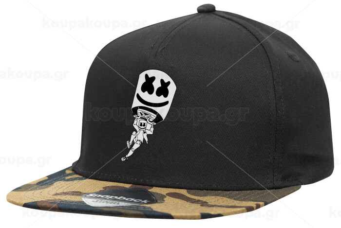 Fortnite Marshmello, Adult Flat Snapback Hat Black/Camouflage, (100% COTTON TWILL, ADULT, UNISEX, ONE SIZE)