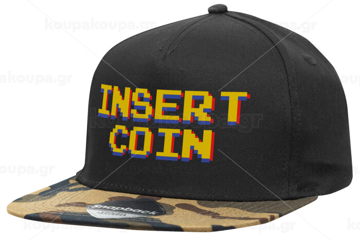 Insert coin!!!, Adult Flat Snapback Hat Black/Camouflage, (100% COTTON TWILL, ADULT, UNISEX, ONE SIZE)