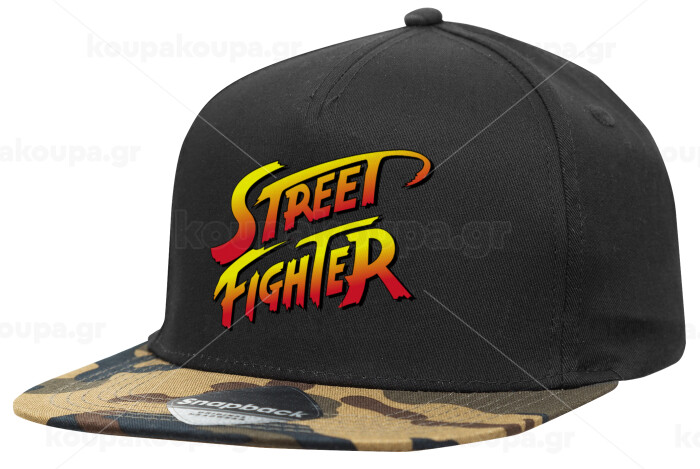 Street fighter, Adult Flat Snapback Hat Black/Camouflage, (100% COTTON TWILL, ADULT, UNISEX, ONE SIZE)