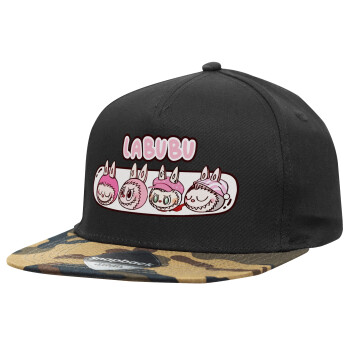 Labubu pink, Adult Flat Snapback Hat Black/Camouflage, (100% COTTON TWILL, ADULT, UNISEX, ONE SIZE)