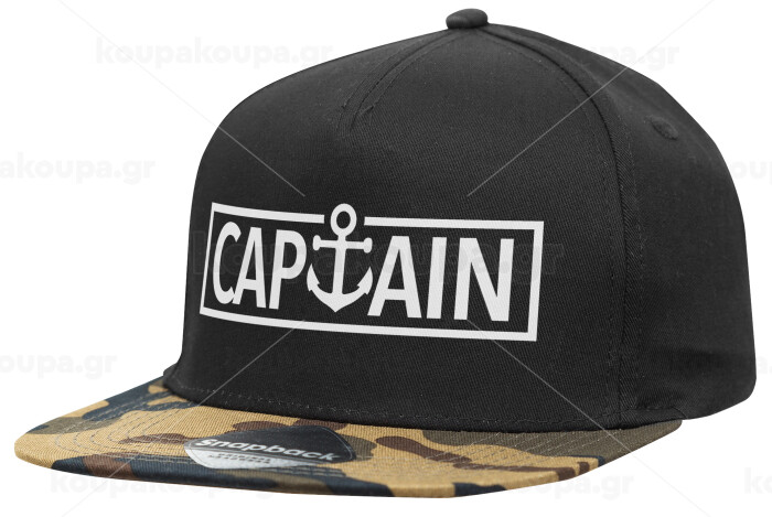 CAPTAIN, Adult Flat Snapback Hat Black/Camouflage, (100% COTTON TWILL, ADULT, UNISEX, ONE SIZE)